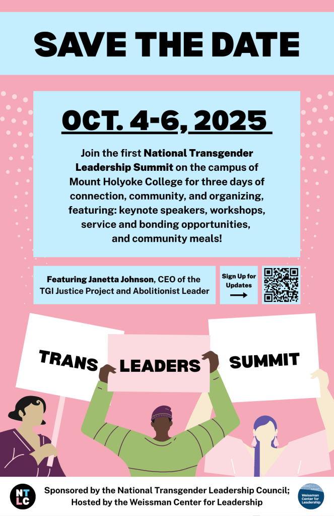 Join the first National Transgender Leadership Summit on the campus of Mount Holyoke College for three days of connection, community, and organizing, featuring keynote speakers, workshops, service and bonding opportunities, and community meals!